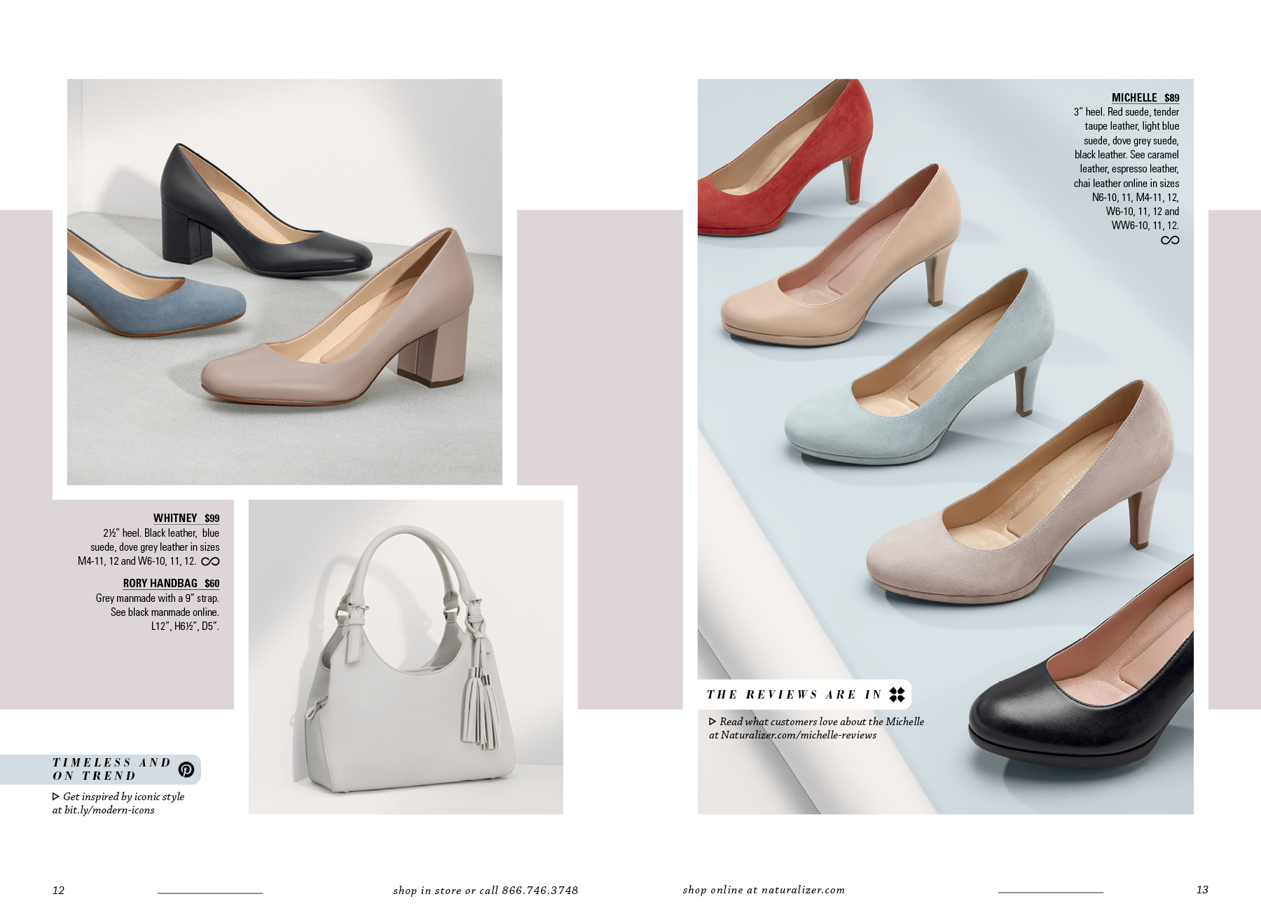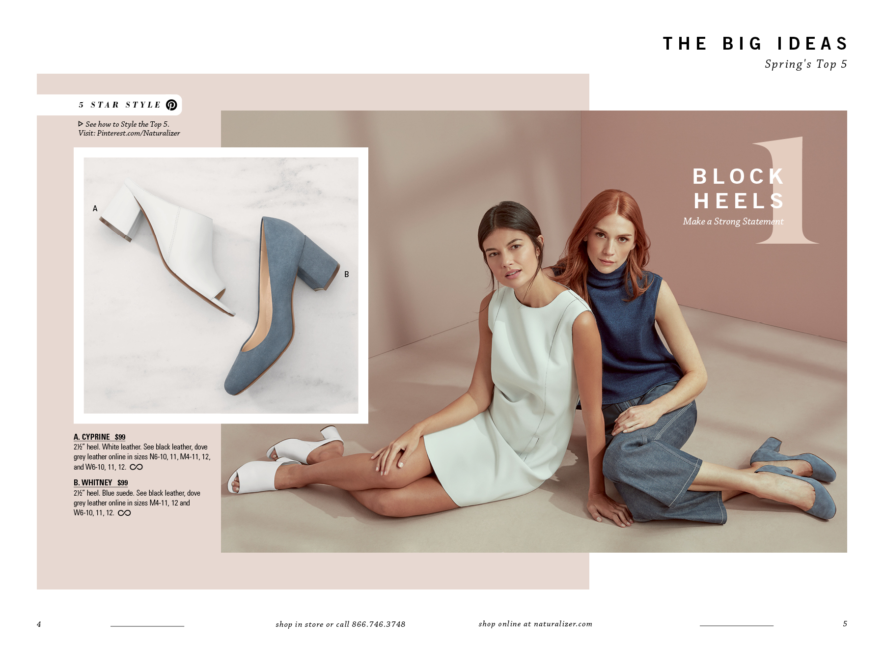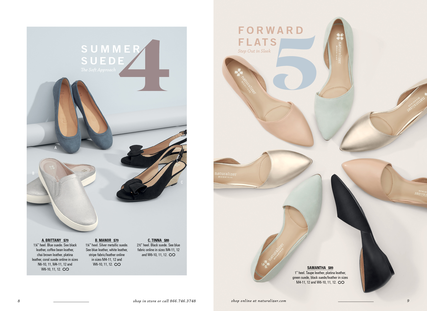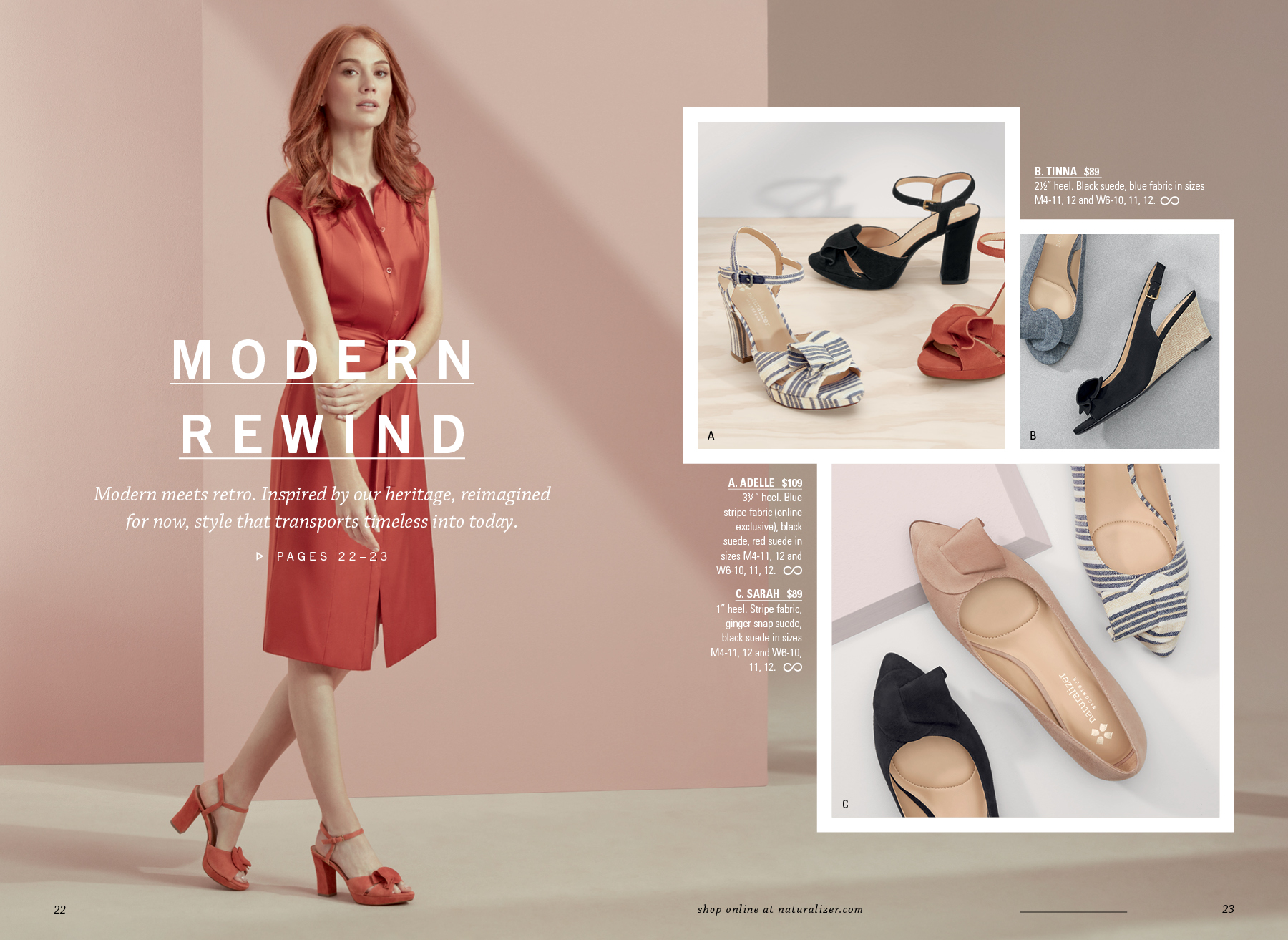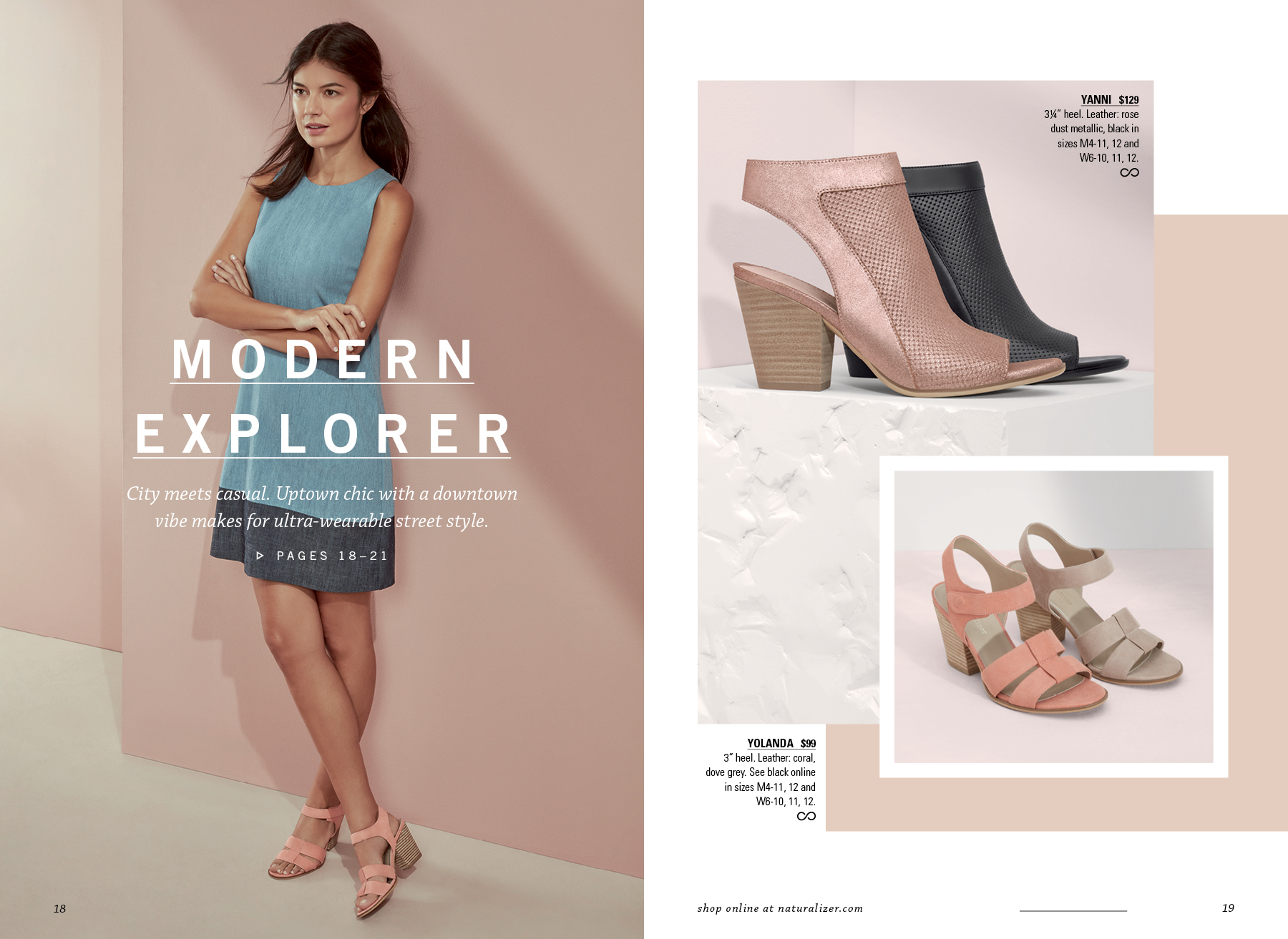 Naturalizer wanted a partner to drive all creative and production aspects of this major international sales vehicle. We worked seamlessly with their Brand Marketing, Merchandising, CRM and Creative teams to re-design the catalog from the ground up. We started with pagination, ensuring a smooth journey through the Spring line, while carefully highlighting key styles. We delivered a new, modern layout design driven by 8 style and trend-based product stories to enhance consumer engagement. We planned over 150 shots, from color, material and detail focus, to set fabrication, propping, shoe positions and camera angle. Playground sourced the photographer, studio and oversaw all production departments and art direction during the 5 day shoot. We also managed the entire post-production process, from retouch, color correction and proofing, to final file assembly, pre-press and printer liaison.