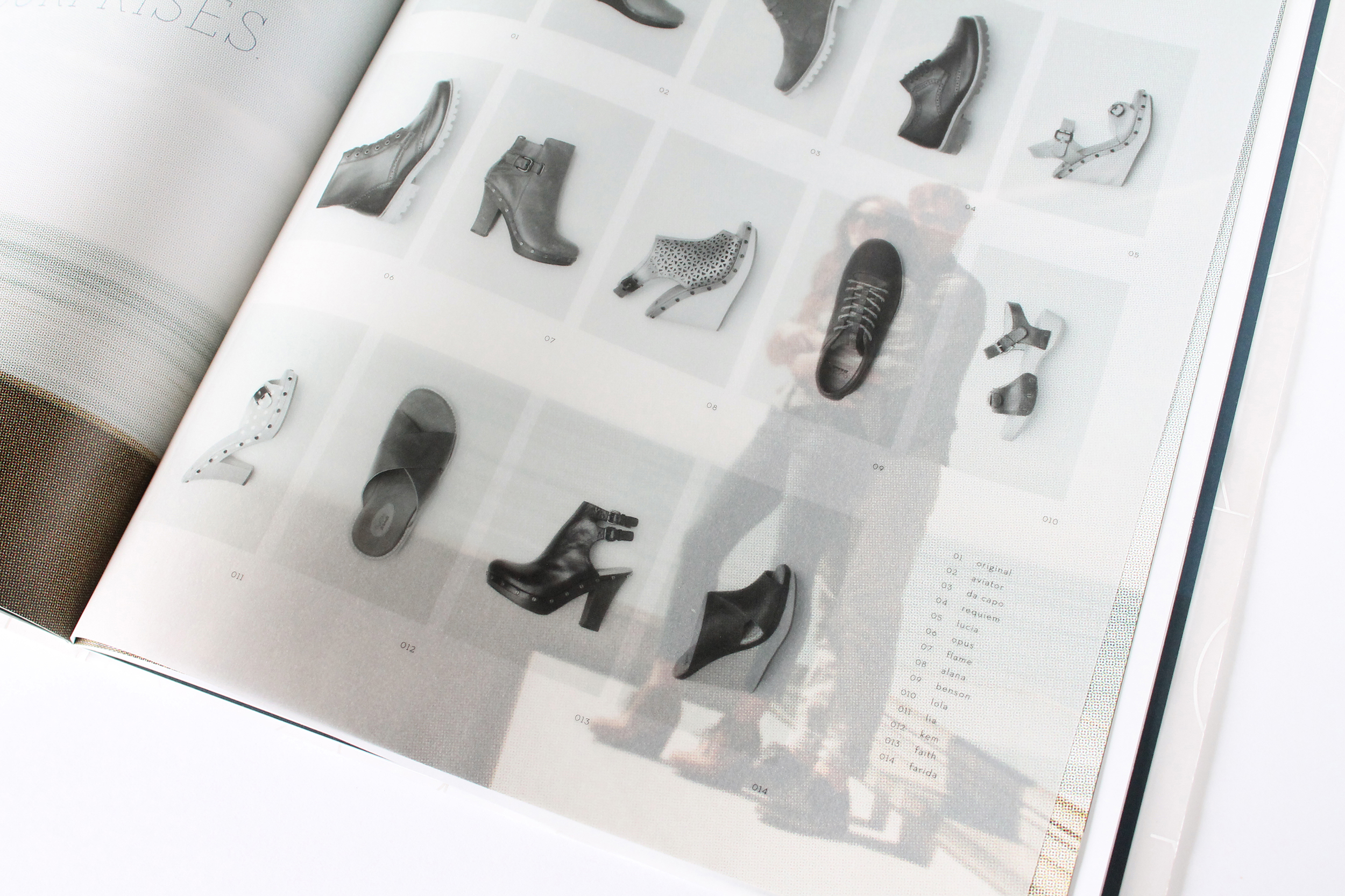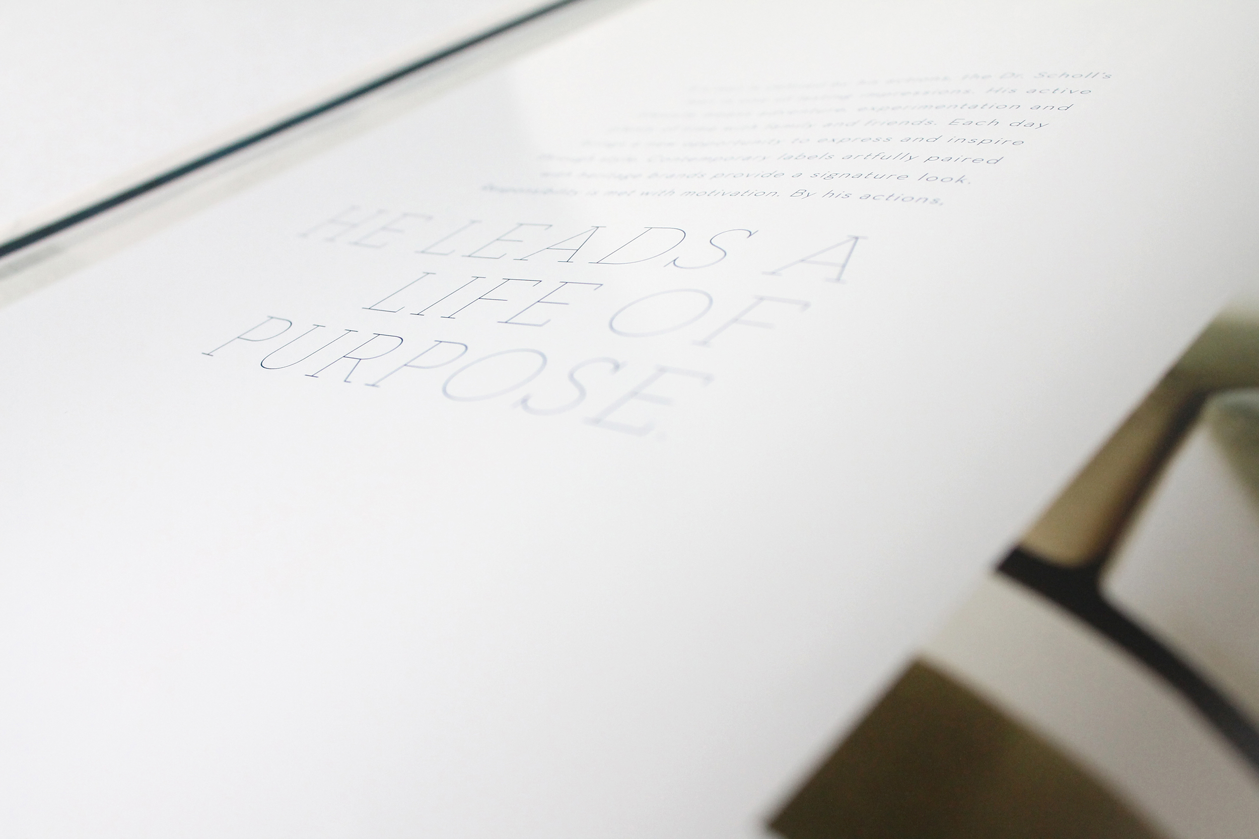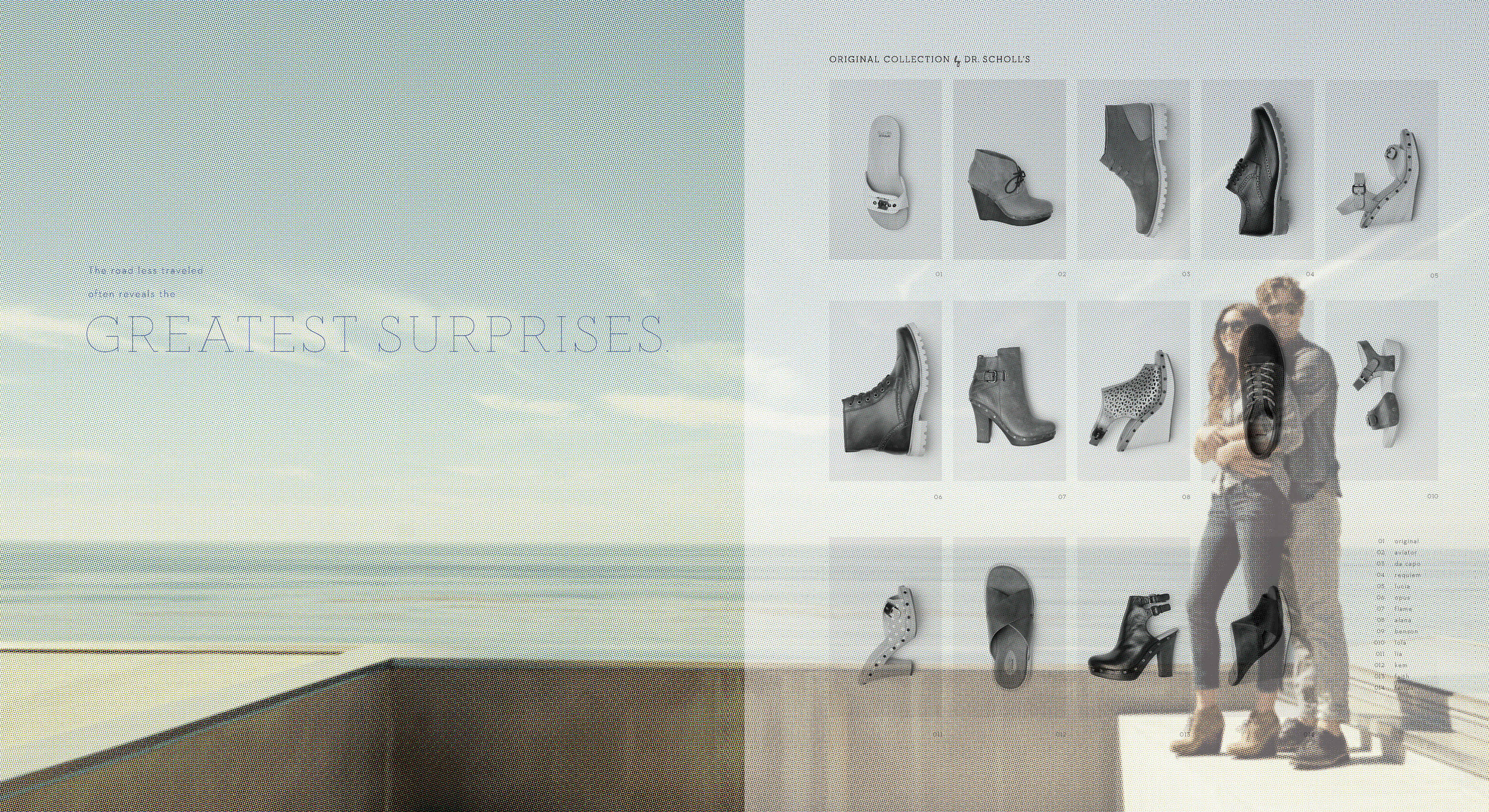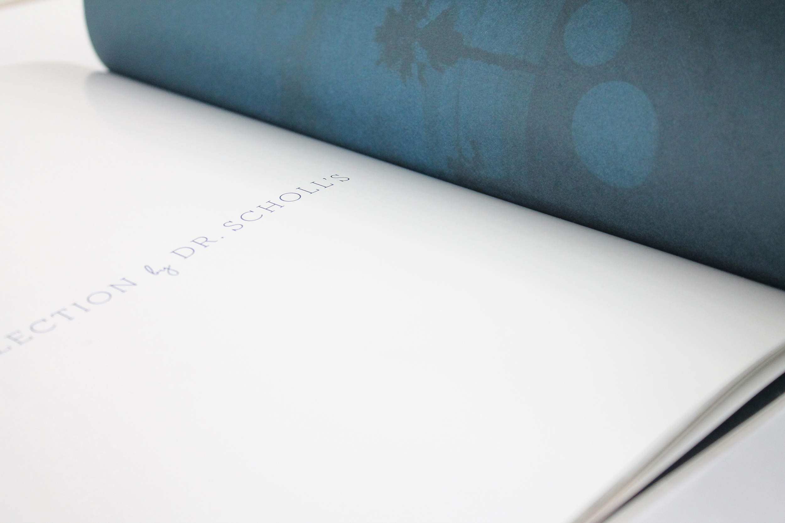 Dr. Scholl's newly launched Original Collection needed a brochure that both introduced the line, and stood out in the crowded fashion/function footwear market. We worked with texture and scale to make an impact, utilizing three unique paper stocks and a 12" square format. The typographic cover wrap and center line sheet were printed on a soft vellum, while the end-papers were navy blue velvet touch printed tone on tone.
